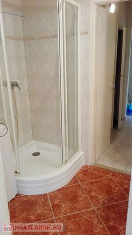A fürdőszoba zuhanykabinos, mosógép is található benne.