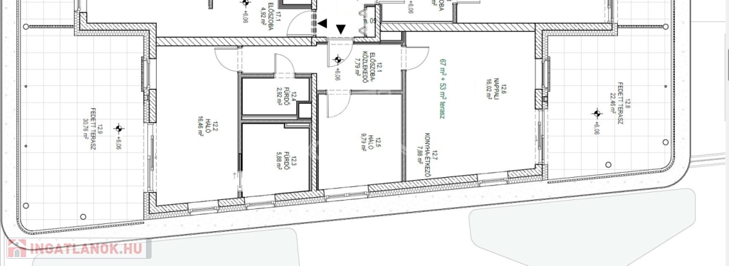 Ez a lakás nappali+2 hálós, 67nm alapterületű+ tartozik hozzá két (22nm+31nm) összesen 53nm fedett terasz is.