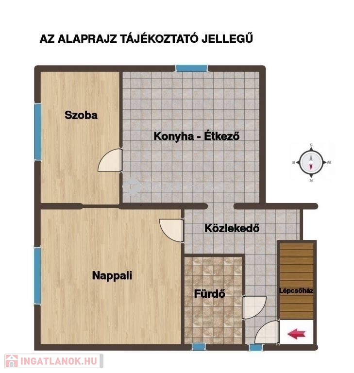 Elosztása kiváló: tágas nappali, külön hálószoba, nagyméretű, étkezős konyha, valamint fürdőszoba szolgálja a kényelmet. A szobák keleti, a konyha déli tájolású, így a lakás egész nap világos és barátságos.
