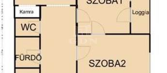 A lakás 2 szobás, erkélyes, külön WC és zuhanyzós fürdőszoba, konyha kis kamráva és háztartási helyiség elosztású.