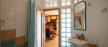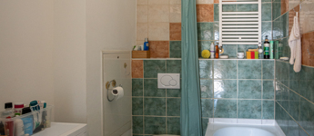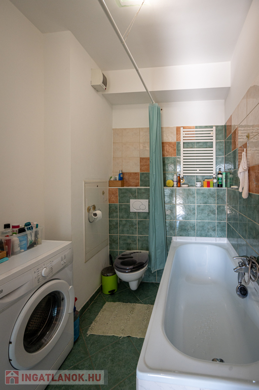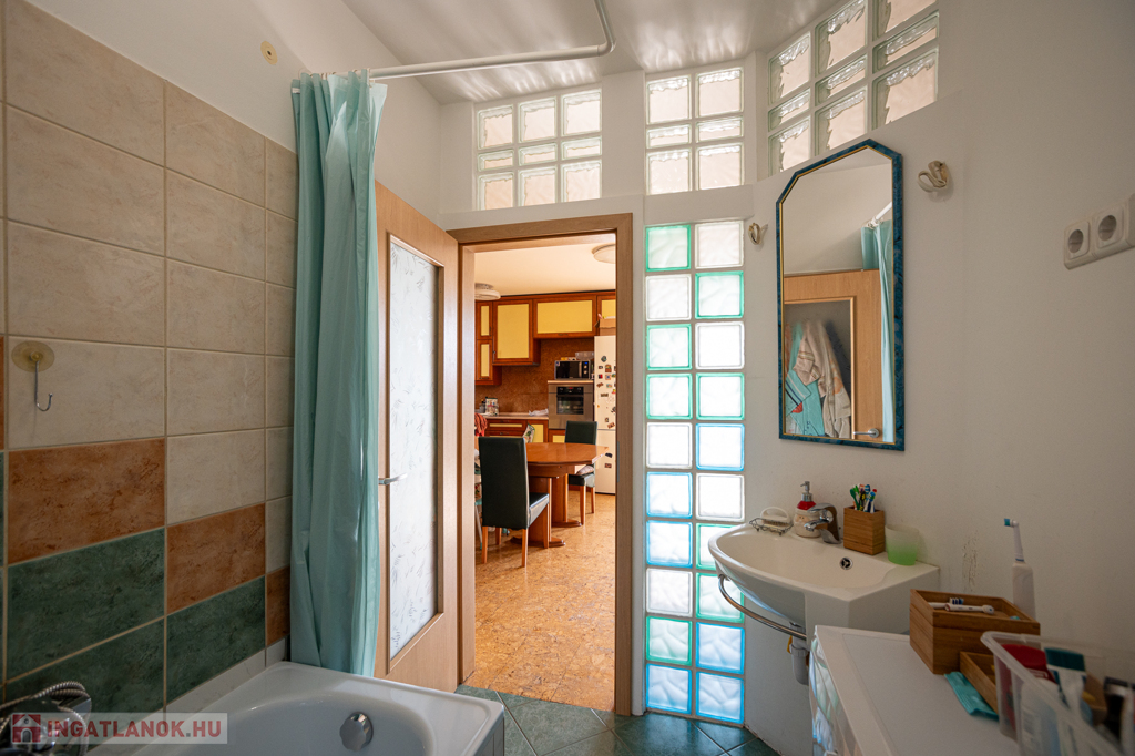 A lakás egyik különlegessége az egyedi hangulatú parafa burkolat, amely természetes, meleg érzetet biztosít, emellett tartós és felújítható. A fürdőszoba üvegtéglás megoldásának köszönhetően természetes fényben fürdik, káddal felszerelt, míg a különálló WC-ben kézmosó is helyet kapott.