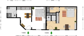 28 nm alapterület: közlekedő, WC, kamra, amerikai konxhás nappali szoba, fürdőszoba