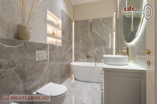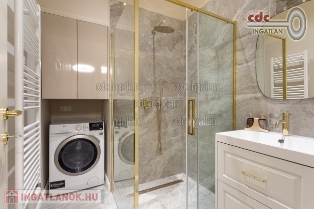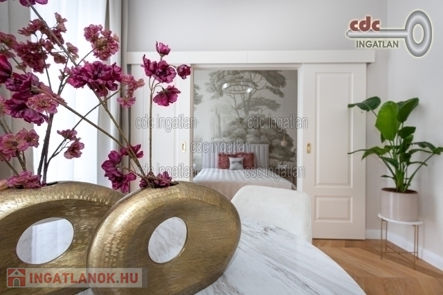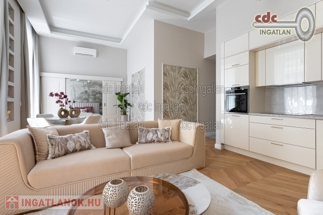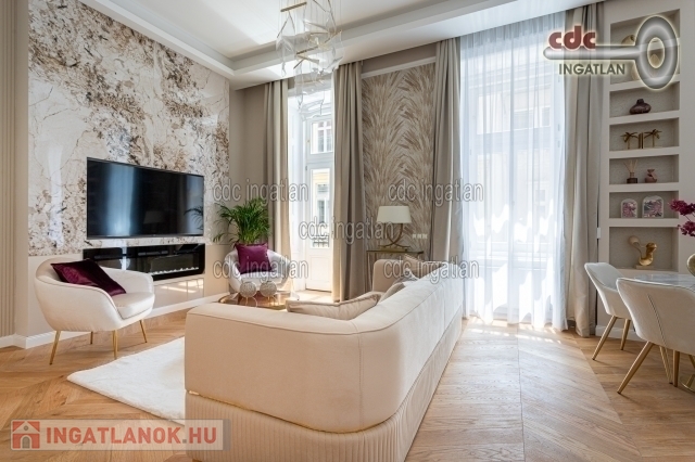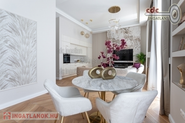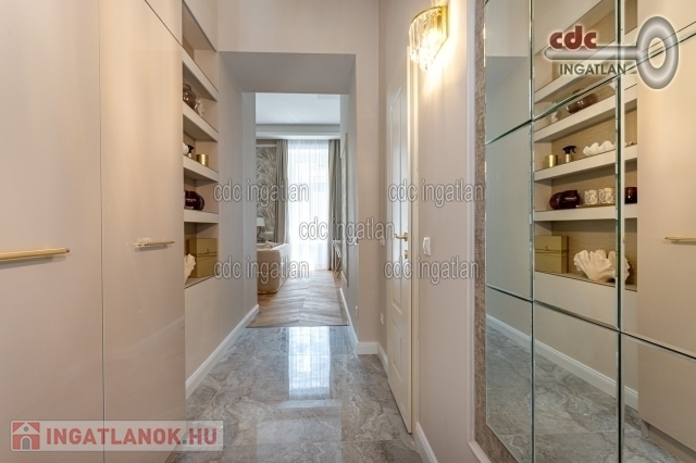 V. kerületben, a Nádor utcában, pár perc sétára a Lánchídtól, 80 m2-es nappali + 2 hálószobás, duplakomfortos, 2. emeleti, erkélyes luxuslakás eladó. Az ingatlan prémium minőségű felújításon esett át, melynek során a legkiválóbb minőségű anyagokat használták fel, a lakás minden részletében az eleganciát tükrözi. Az ingatlan amerikai konyhás nappalival rendelkezik, az erkély illetve a fő hálószoba a csendes Mérleg utcára néz, míg a második hálószoba a nyugodt belső udvarra nyílik. Mindkét hálószobához külön fürdőszoba tartozik, a fő hálószobához egy elegáns káddal, WC-vel és bidével felszerelt fürdő kapcsolódik, míg a második hálószobához egy modern zuhanyzós. A lakásban külön vendég WC is található. Az ingatlan prémium minőségű bútorokkal és gépekkel együtt eladó, így az új tulajdonos azonnal beköltözhet egy teljesen felszerelt, exkluzív otthonba. A teljes körű felújítás során új fa nyílászárók lettek beépítve, valamint minden víz- és villanyvezetékek cserélve lett. Designer csillárok, beépített szekrények, minőségi szaniterek és prémium burkolatok kerültek beépítésre. A 4 méteres belmagasság és a chevron mintás tölgyfa parketta különleges, elegáns hangulatot kölcsönöz az otthonnak. A konyha teljesen gépesített, AEG márkájú készülékekkel felszerelt: mosogatógép, hűtő fagyasztóval, sütő, főzőlap, páraelszívó és mosógép is rendelkezésre áll. Az ingatlan kényelmét három légkondicionáló és automata sötétítők biztosítják. A fűtés házközponti, a közös költség víz nélküli díja 33.104 Ft havonta. A társasház Hild József híres magyar építész egyik remekműve. Az épület az 1800-as években épült, és azóta számos felújításon esett át, megőrizve eredeti szépségét és eleganciáját. Ez a lakás nem csak otthonként, hanem befektetésként is tökéletes választás azok számára, akik a belvárosi luxust és kényelmet keresik. Az ingatlan minden részlete a legmagasabb színvonalat képviseli, így garantáltan megfelel a legigényesebb vásárlók elvárásainak is.