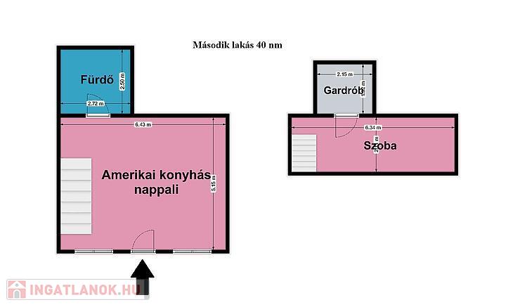 A másik lakás nagyobb méretű: alsó szintje 40 nm, a galériás felső szinttel együtt 55 nm. Tágas, világos terek jellemzik, a felújítás során itt is korszerű anyagokat használtak, a lakás teljesen bútorozott, berendezve várja új tulajdonosát.