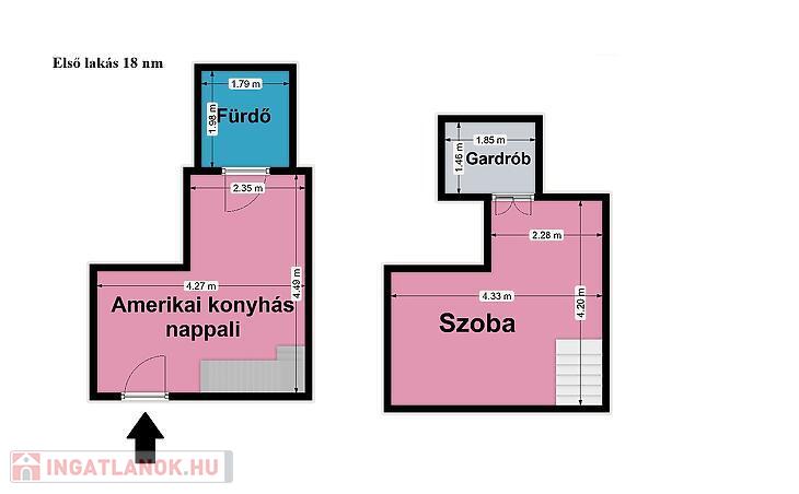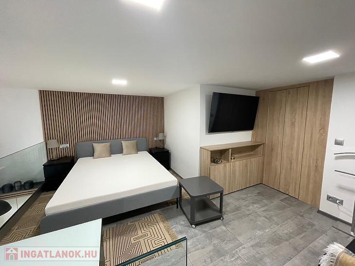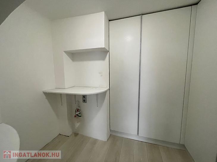 Az egyik lakás egy kisebb alapterületű, kompakt, de minden igényt kielégítő otthon: az alsó szint 18 nm, a galériával együtt 35 nm. Ideális lehet rövid távú kiadásra, fiatal pároknak vagy akár irodai használatra is. Teljeskörű felújításon esett át, modern burkolatokkal, beépített bútorokkal és gépesített konyhával, így azonnal költözhető vagy hasznosítható.