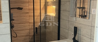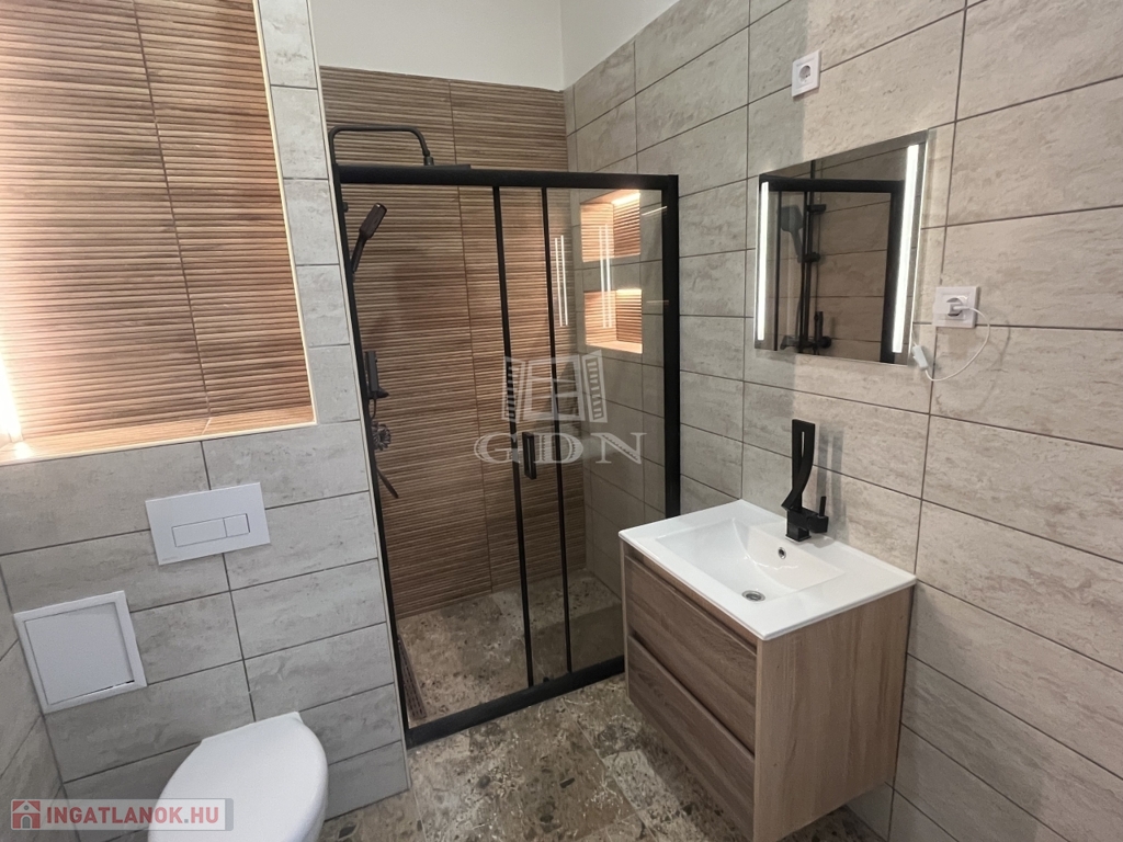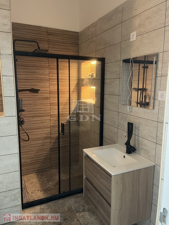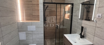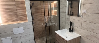 Fürdőszoba: mosdószekrény, törülközőszárító, modern zuhanykabin elhúzható ajtóval