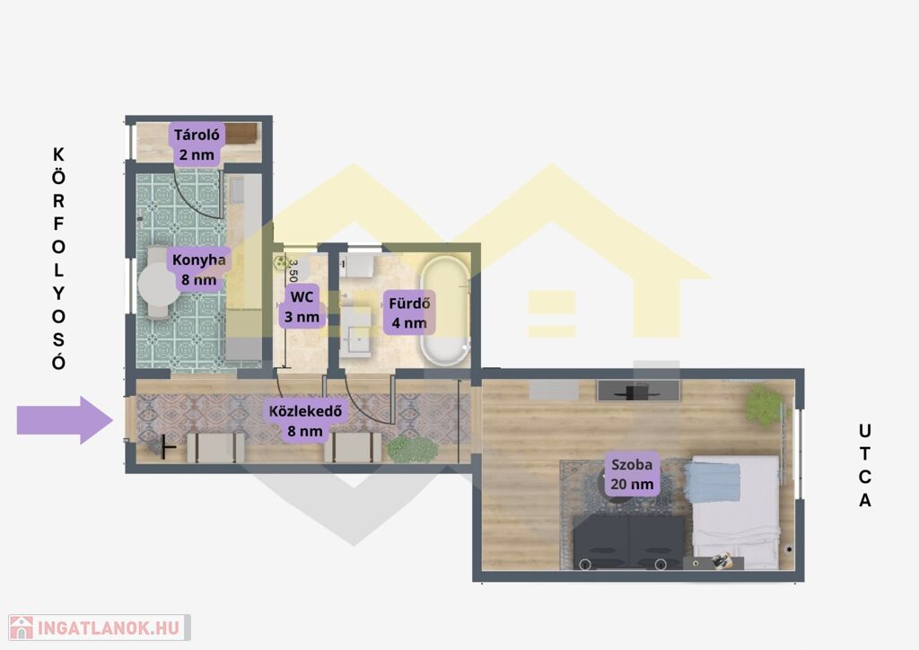 A 45 nm-es lakást a második emeleten találhatjuk, amit egy szép lépcsőházon keresztül vagy lifttel közelíthetünk meg. A bejárat a körfolyosóról nyílik az előszobába, ahol balra rögtön a konyha található, külön tárolóval. A hosszú előszobából balra nyílik még a fürdőszoba, és külön toalett. A közlekedő végén a 20 nm nappali tárul elénk. Ablakai az egyirányú utcára néznek.