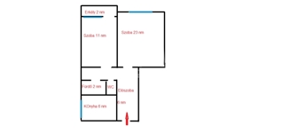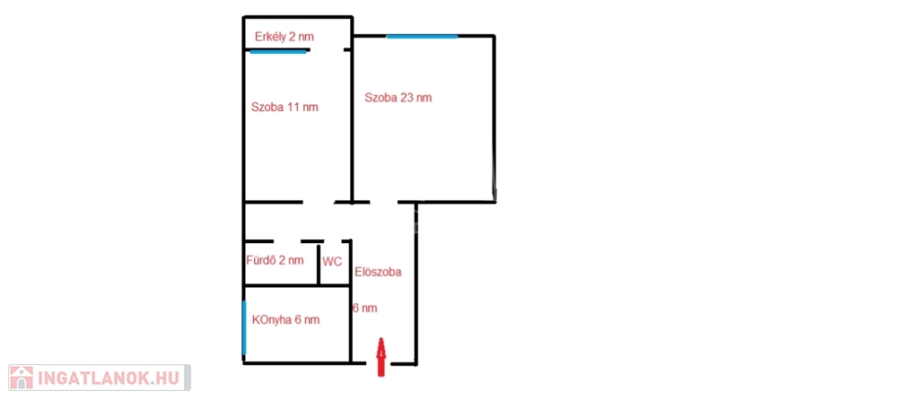 Belépve a 6 nm-es előszobába érkezünk, bal oldalon találjuk az ablakos 6 nm-es konyhát, szemből lépünk a 23 nm-es nappali szobába, mellette kapott helyet a kisebbik 11 nm-es szoba a helyiségből tudunk kilépni a 2 nm-es beüvegezett erkélyre.