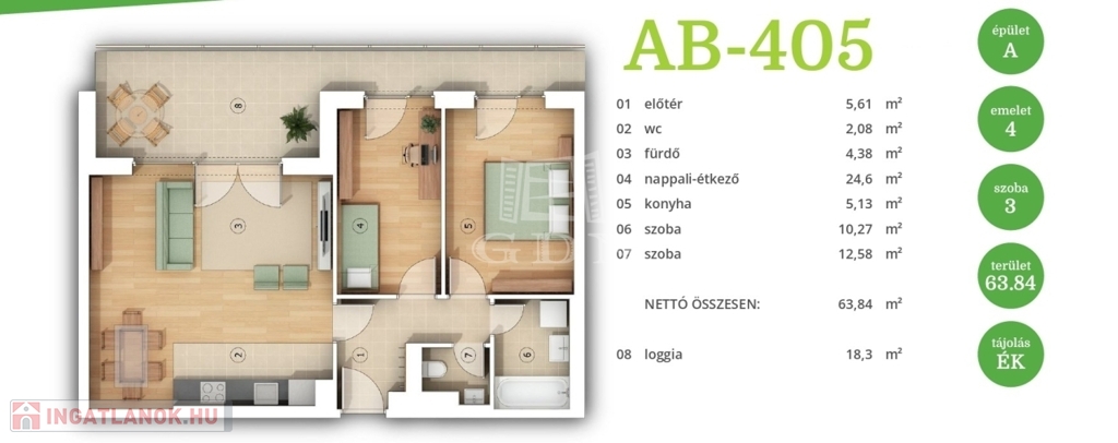 Ez a lakás nappali+2 hálós, 64nm alapterületű és tartozik hozzá egy 18nm-es terasz is.