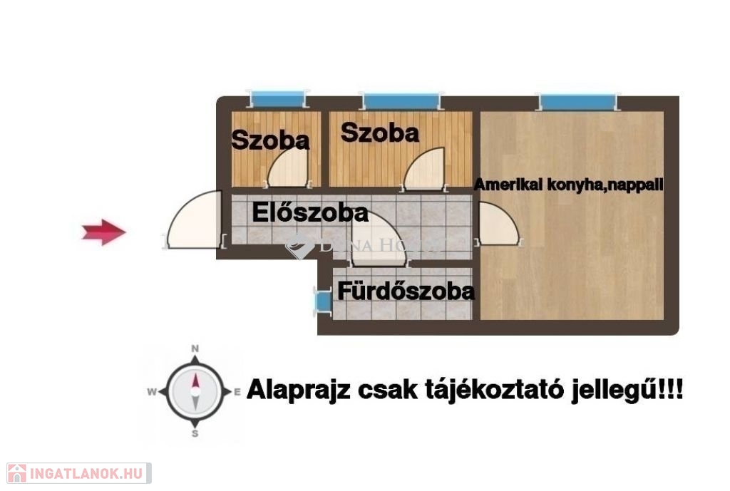 Belépve egy közlekedő fogad, ahonnan egy kisebb szoba nyílik tökéletes gardróbnak vagy dolgozószobának. Ezen kívül van egy tágas hálószoba, amerikai konyhás nappali, tusolós fürdőszoba WC-vel.