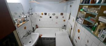 A fürdőszoba és a WC egy helyiségbe nyílik, kádas, felújítást igényel.