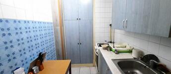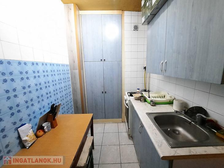 Közlekedő és a konyha járólappal és csempével burkolt, a konyhabútor átlagos állapotú, használható.