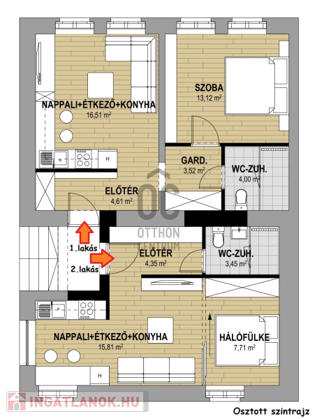 Az ingatlan egy nagyobb alapterületű lakás kettéosztásával valósul meg, figyelembevéve az egyedi bejárást és teljes önállóságot.