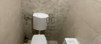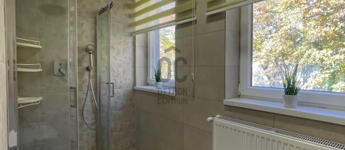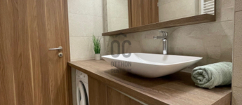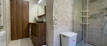 A fürdőszoba tusolóval, beépített szekrényekkel és mosógéppel ellátott.