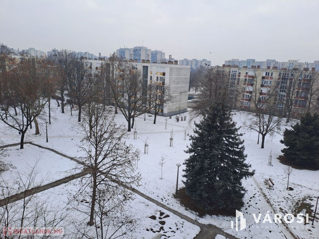 A nappaliban található beépített szekrények praktikus tárolási megoldásokat kínálnak. Ebből a szobából nyílik egy kis francia erkély, amely a parkra néz, minden ablak DNY-i tájolású.