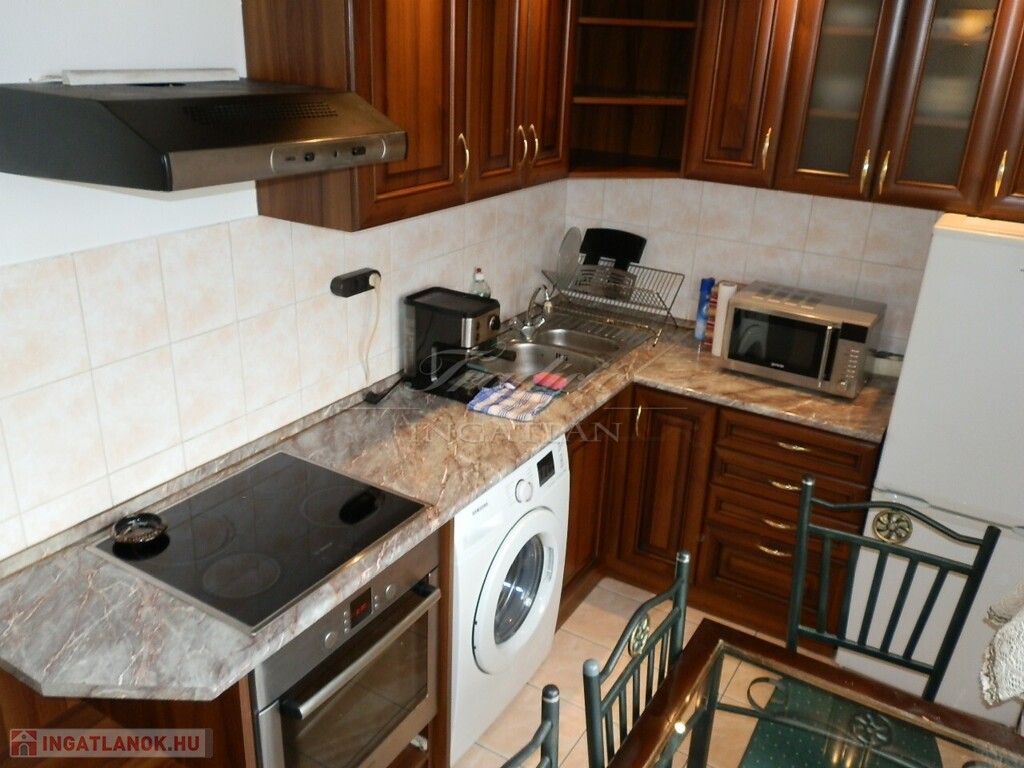 A távfűtéses ingatlan, jó minőségű konyhabútorral van szerelve, amelyben még a mosógép is helyet kapott.