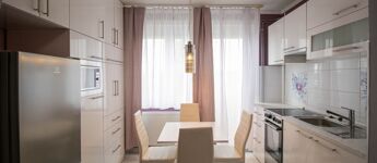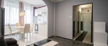 A 3. emeleti francia erkélyes lakásban az amerikai konyhás nappali mellett 2 szoba is található, így gyermekkel is vállalható a lakás.