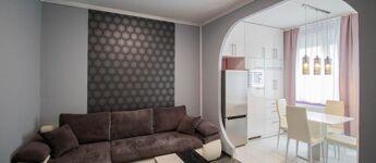 - A konyhában méretre gyártott beépített konyhabútor beépített gépekkel: hűtő-fagyasztó szekrény, villanytűzhely, páraelszívó, mosógép