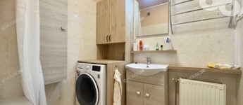Fürdőszobában kád és kézmosó.