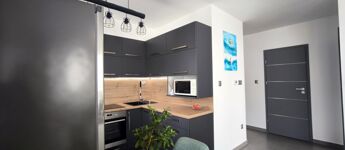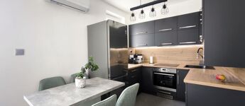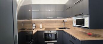 - Konyha igényes, modern beépített konyhabútorral, beépített gépekkel: Bosch mosogatógép, Elektrolux sütő és indukciós főzőlap, páraelszívó.