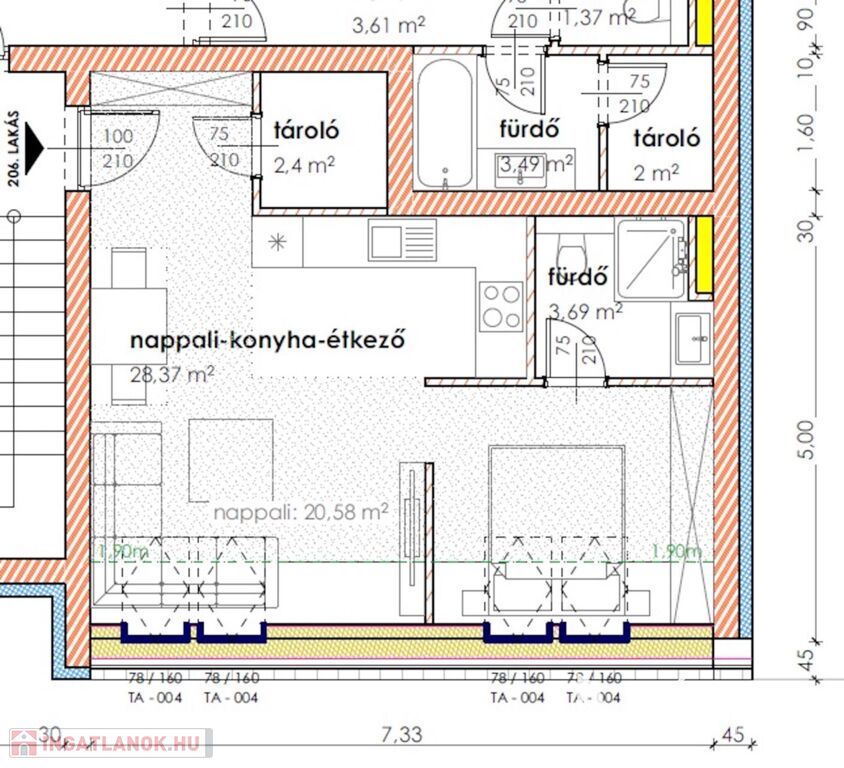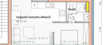 A 1 db amerikai konyhás nappalival, 1 db fürdőszobával, közlekedővel, rendelkezik.
