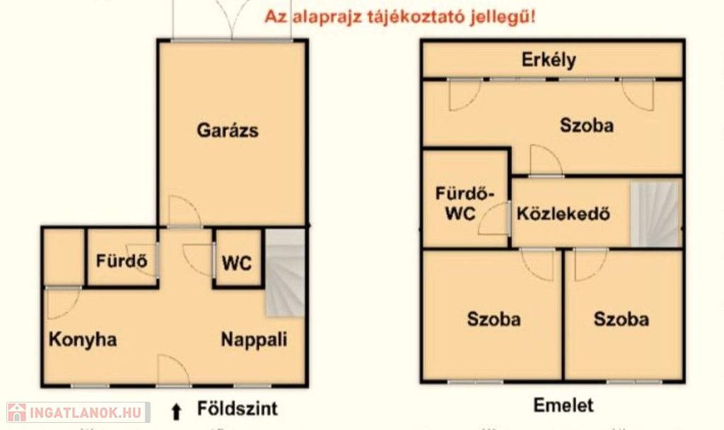 A földszinten található az amerikai konyhás nappali, közvetlen garázskapcsolattal, zuhanyzós fürdőszoba, WC, és a kazánház. A kényelmes lépcsőn megközelíthető az emeleti szinten kialakított, 3 külön nyíló szoba,( igény szerint az egyik szoba kettéosztható) fürdőszoba- WC-vel.