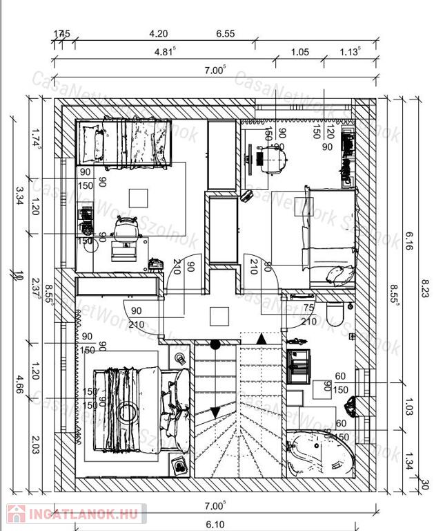 - elosztását tekintve előtér, nappali, konyha-étkező, 3 szoba, 2 db fürdőszoba + wc, közlekedő, terasz