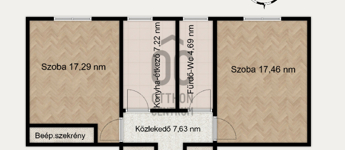 Az ingatlanban 2 különnyíló szoba, konyha-étkező, fürdőszoba- Wc, közlekedő helyiségek találhatóak, illetve több beépített szekrény biztosítja az optimális helykihasználást és tartozik egy önálló és egy közös használatú tároló is a lakáshoz.