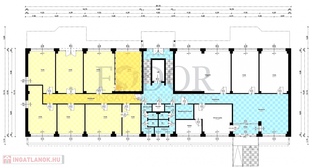 A XIII. kerület Angyalföld részén, a Topolya utcában kínálok kiadásra 8 db eltérő méretű irodahelyiséget összesen 190 m² alapterületen. Az ingatlan magában foglal egy mágneskártyával nyitható, privát, lezárt folyosót is. Az irodahelyiségek között gipszkarton falak választják el egymást, így könnyen alakíthatók. Az alaprajzon sárgával jelölt területek a kiadó irodák.