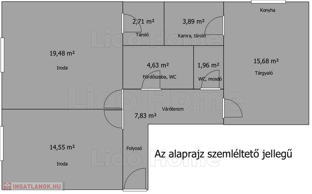 - alapterület: 69 m2: 2 iroda/szoba, 1 tárgyaló/nappali - konyhával, 1 WC mosdóval, 1 fürdőszoba zuhanyzóval, WC-vel, mosdóval, közlekedő, váróterem, tárolók