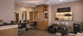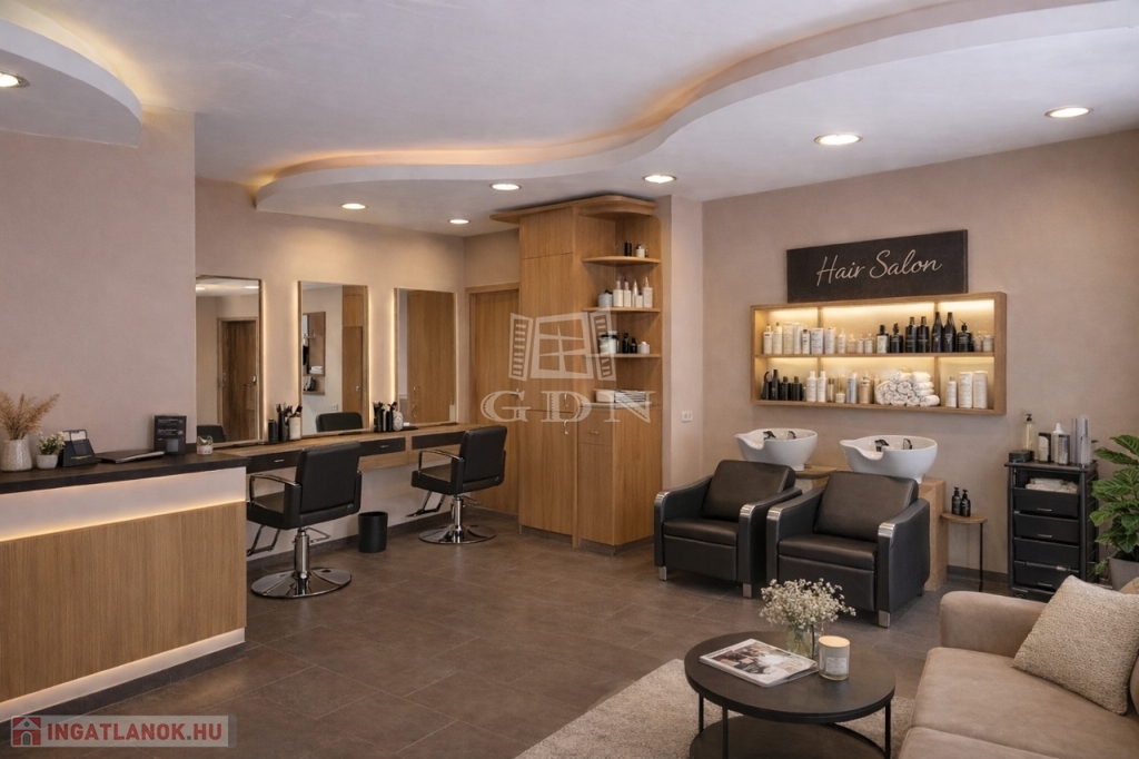A főoldalon és az első képen látható enteriőr illusztráció, amely egy lehetséges butik, szépségszalon vagy fodrászat kialakítását mutatja be – a tér könnyen újrapozicionálható a célpiac igényei szerint.
