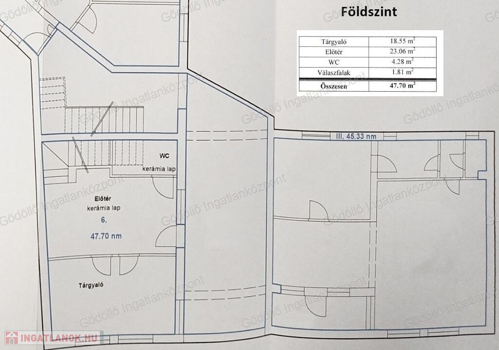 - Földszint (47,7 nm): előtér, akadálymentesített tárgyaló és mosdó