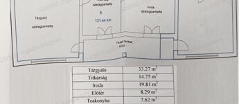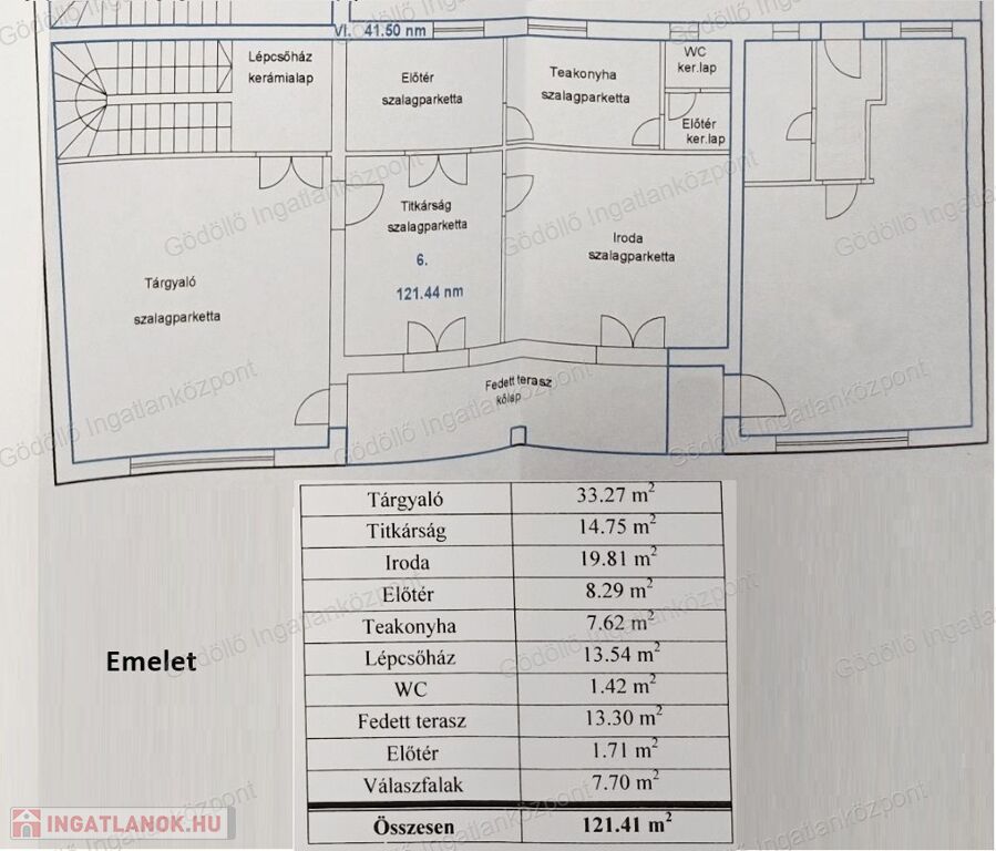 - Emelet (121,41 nm): előtér, tárgyaló, titkárság, iroda, teakonyha, mosdó, fedett terasz