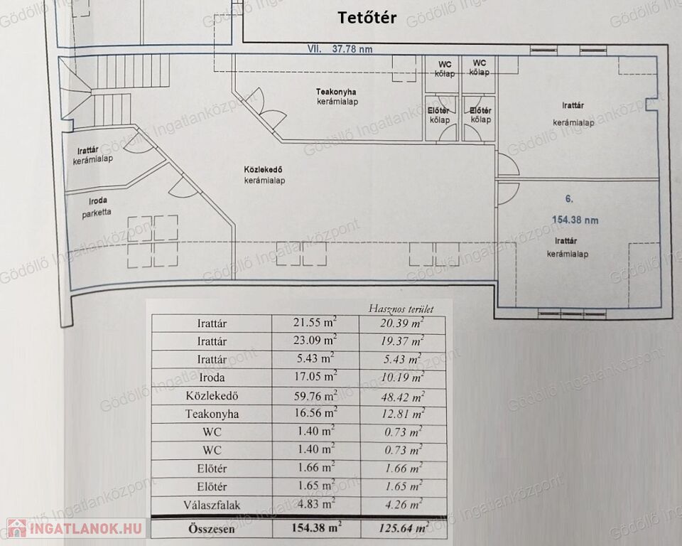 - Tetőtér (125,64 nm): előtér, 3 irattár, iroda, közlekedő, teakonyha, 2 mosdó