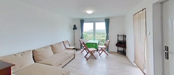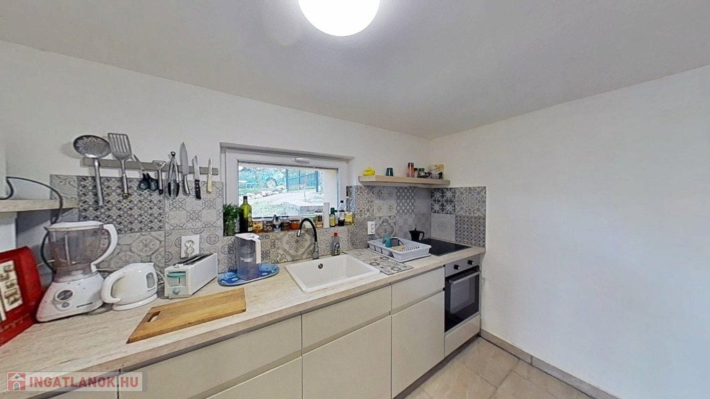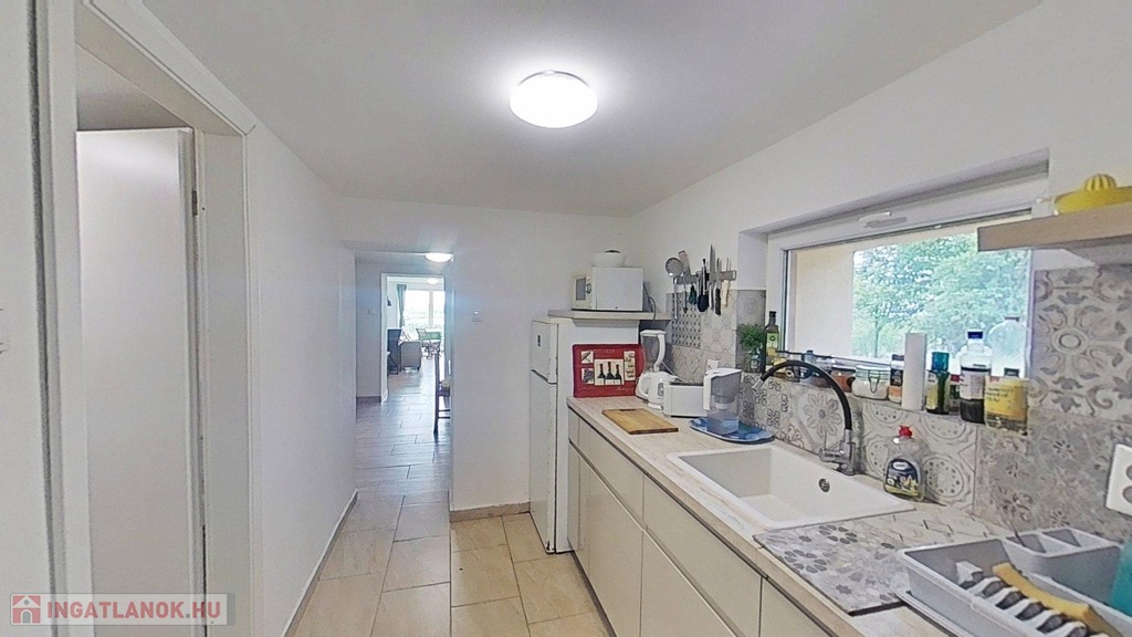 A D-i tájolású, 3 szintes, 106 m2-es, 3 szobás, tégla építésű ikerház félhez 1088 m2-es, enyhén lejtős, körbekerített telek tartozik. Gyümölcsfával, fügefákkal, örökzöld bokrokkal részben beültetett kertje tovább növeli a hely intimitását, valamint a nagysága lehetőséget teremt akár tiny house vagy jurta elhelyezésére.