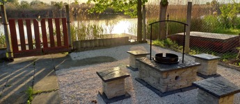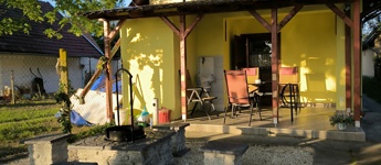 Az épülethez a víz felőli részen egy fedett terasz tartozik, előtte szépen kialakított szalonnasütő és bográcsozó. Az udvar felőli részen két külön tárolóhelyiség található.