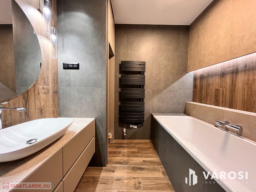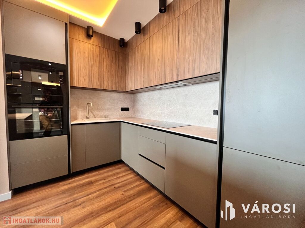 A konyha teljesen gépesített, a beépített berendezések a legmagasabb minőséget képviselik. A lakás belső tereit designer tervezte, minden beépített anyag és felület prémium kategóriás.