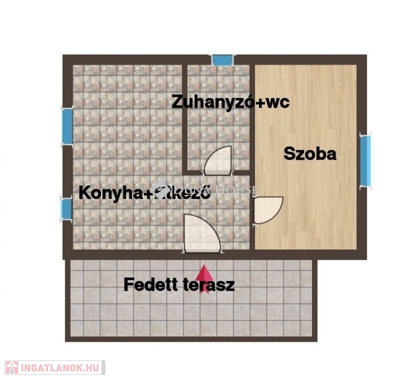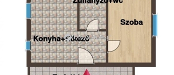 Szoba, konyha+étkező, fürdő+wc kialakítással.