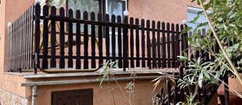 A telket beton lábazatos, tégla kerítés határolja, faszerkezetű kapukkal.