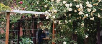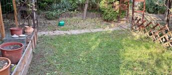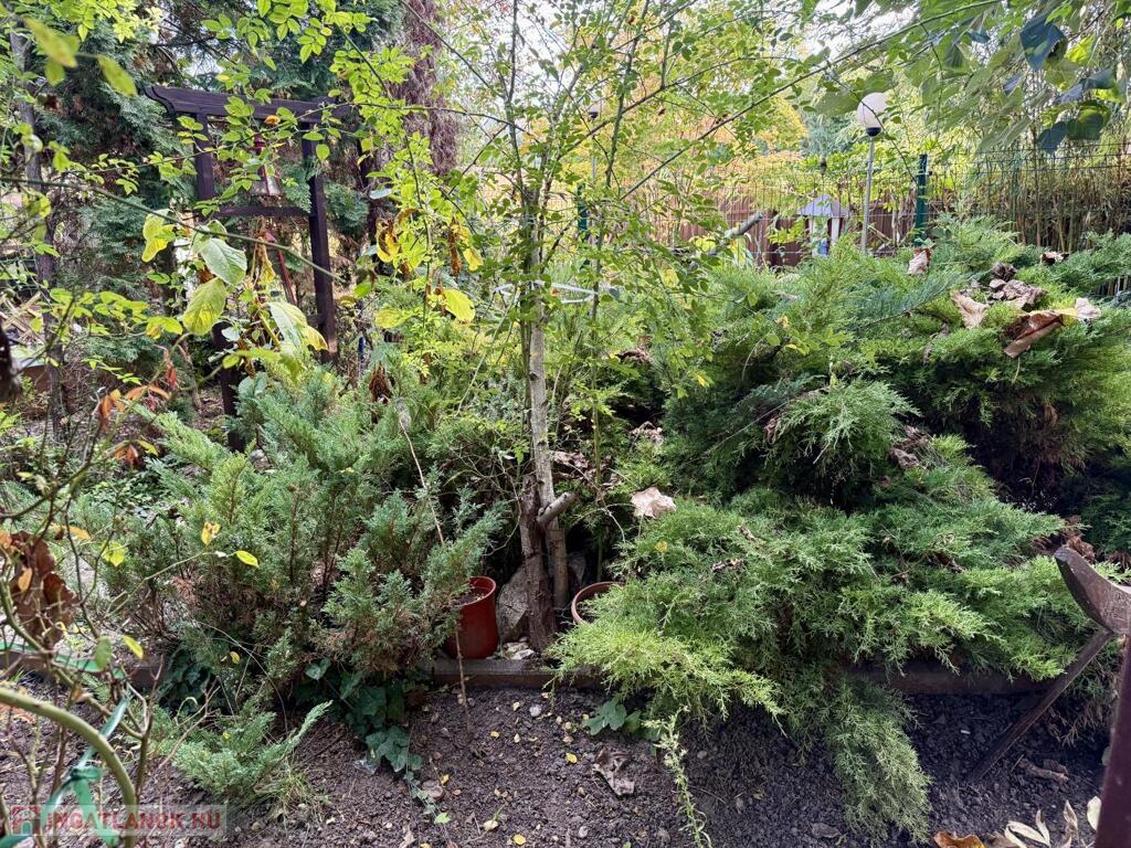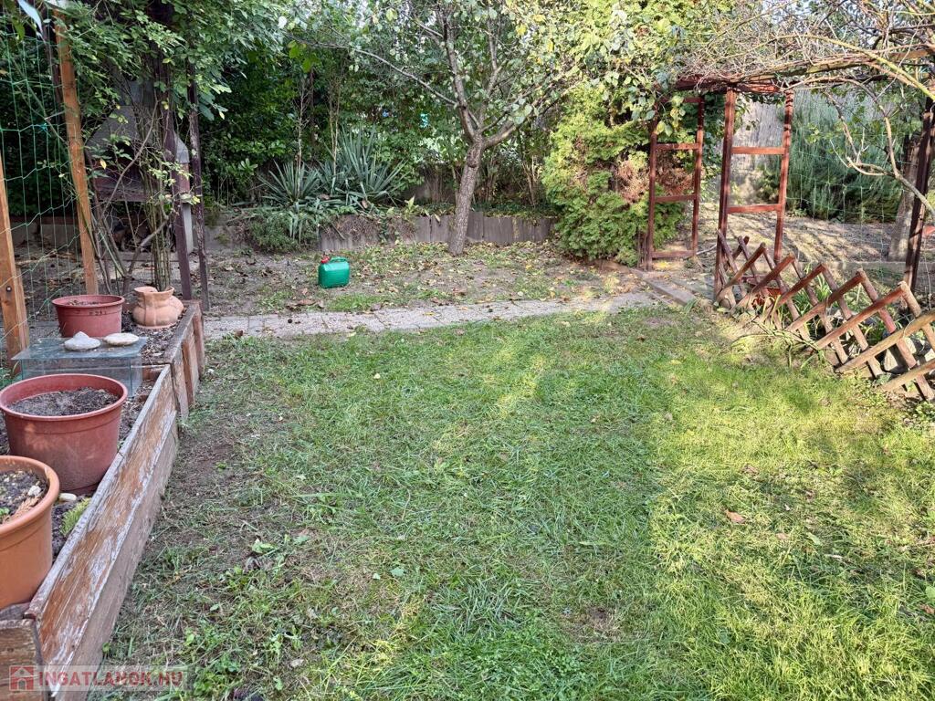 A telek végében konyhakert, mellette kis téglaépületek (állattartásra vagy tárolásra alkalmas).