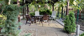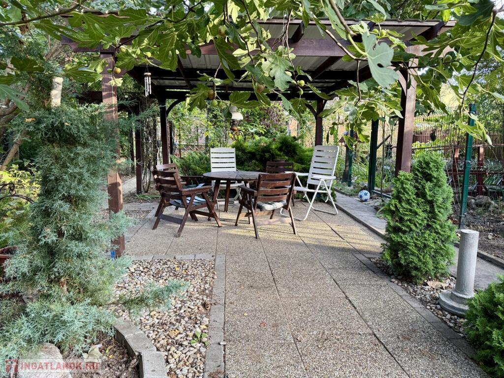 A kertben kerti tó, fa híd, dísznövények, gyümölcsfák, örökzöldek, fedett filagória, valamint kültéri sütögető is található.