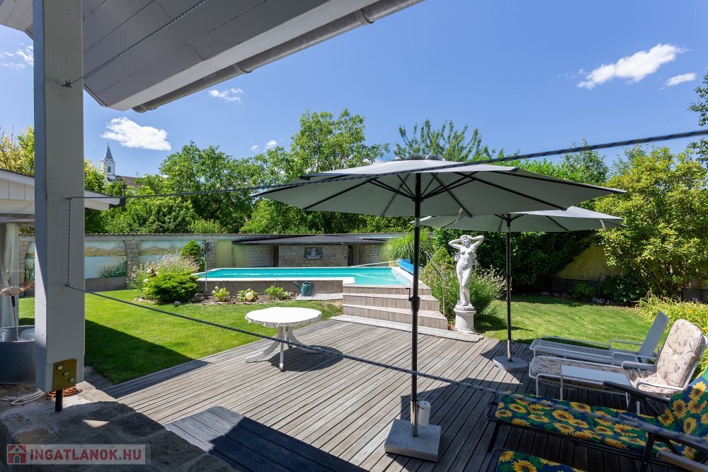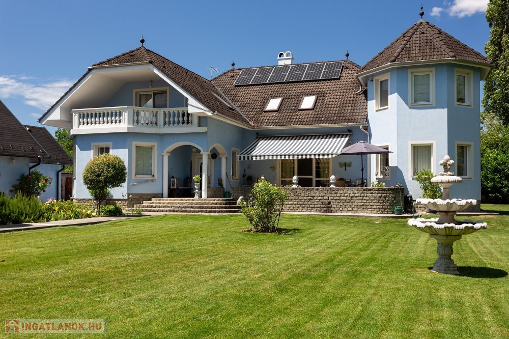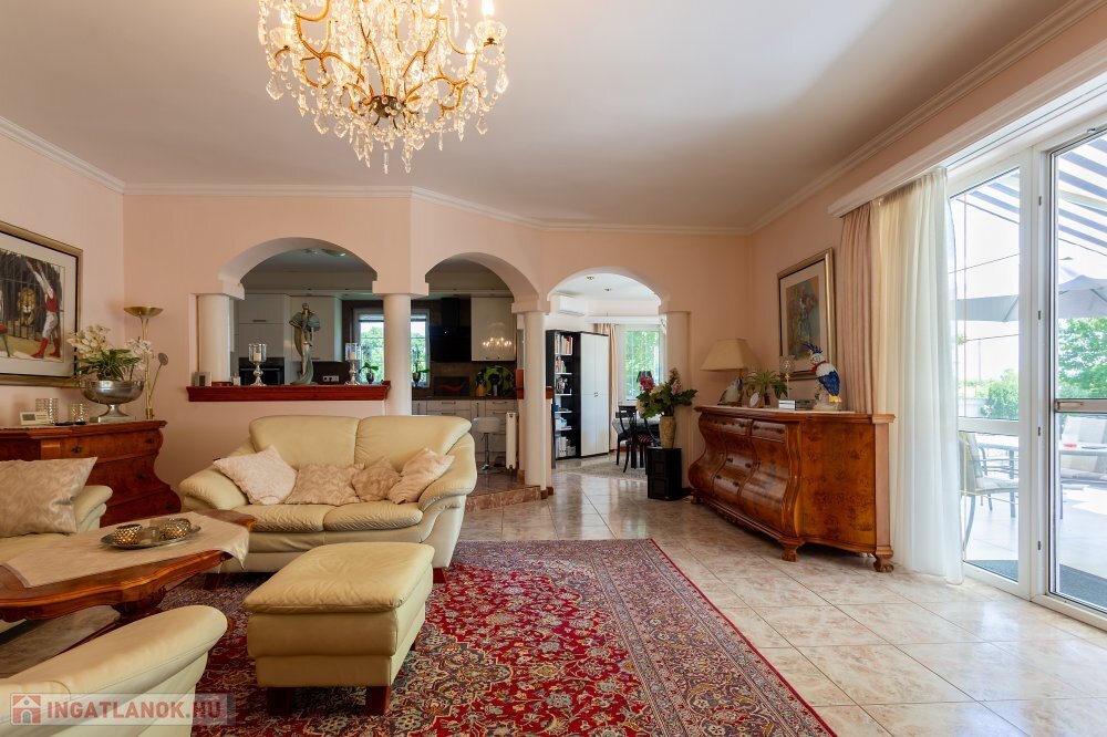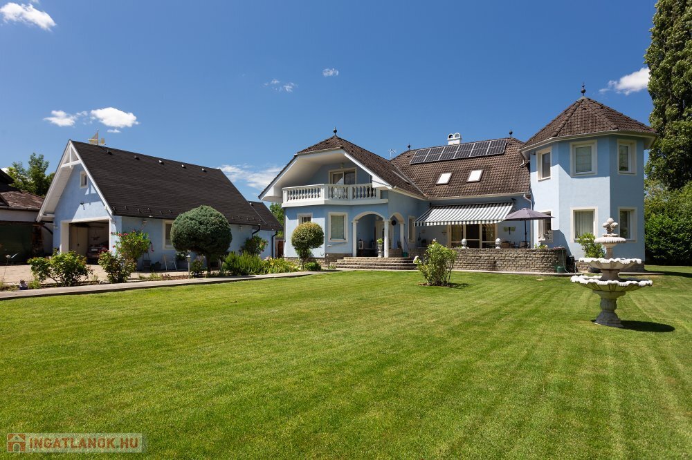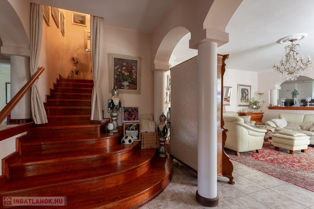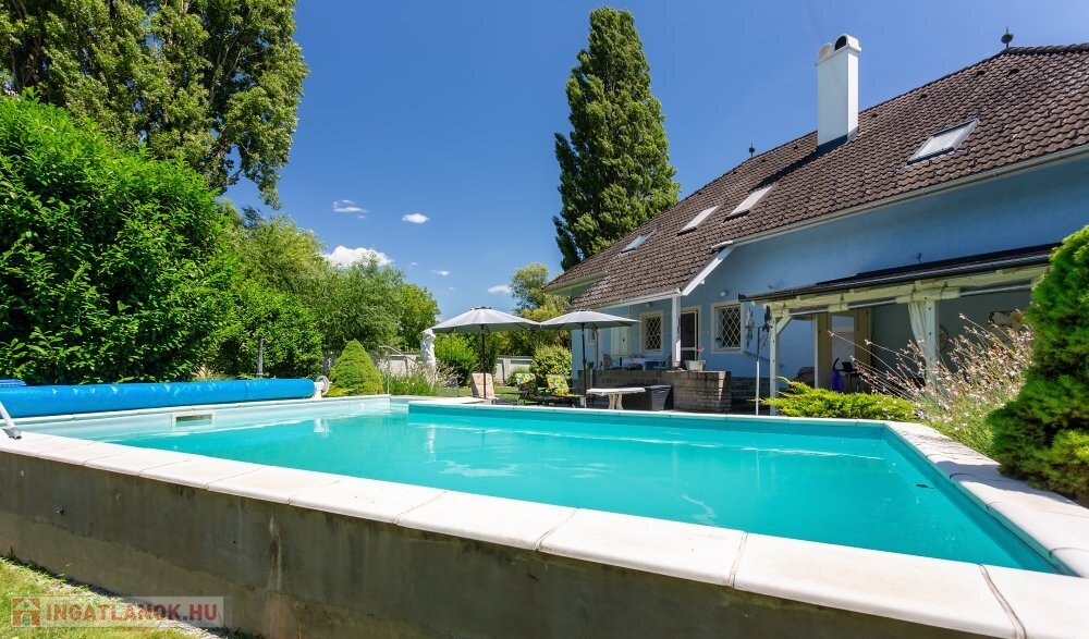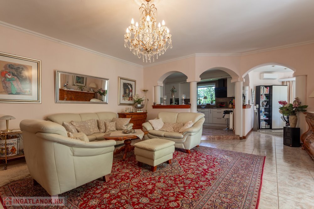 A 280 m²-es, kiváló állapotban lévő, napfényes lakóingatlan egy 1762 m²-es, parkosított telken helyezkedik el, medencével, borospincével és duplagarázzsal kiegészülve.