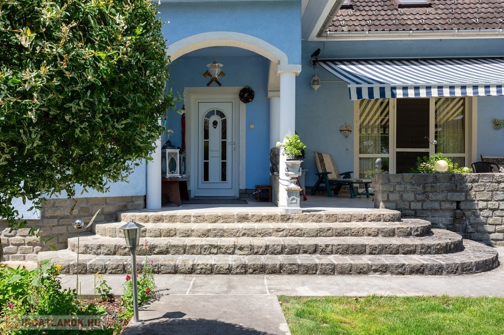 Ez a 280 m²-es, mediterrán stílusban épült lakóház egy 1762 m²-es, gondosan parkosított telken helyezkedik el Aszófőn, alig pár percre Balatonfüredtől és Tihanytól.