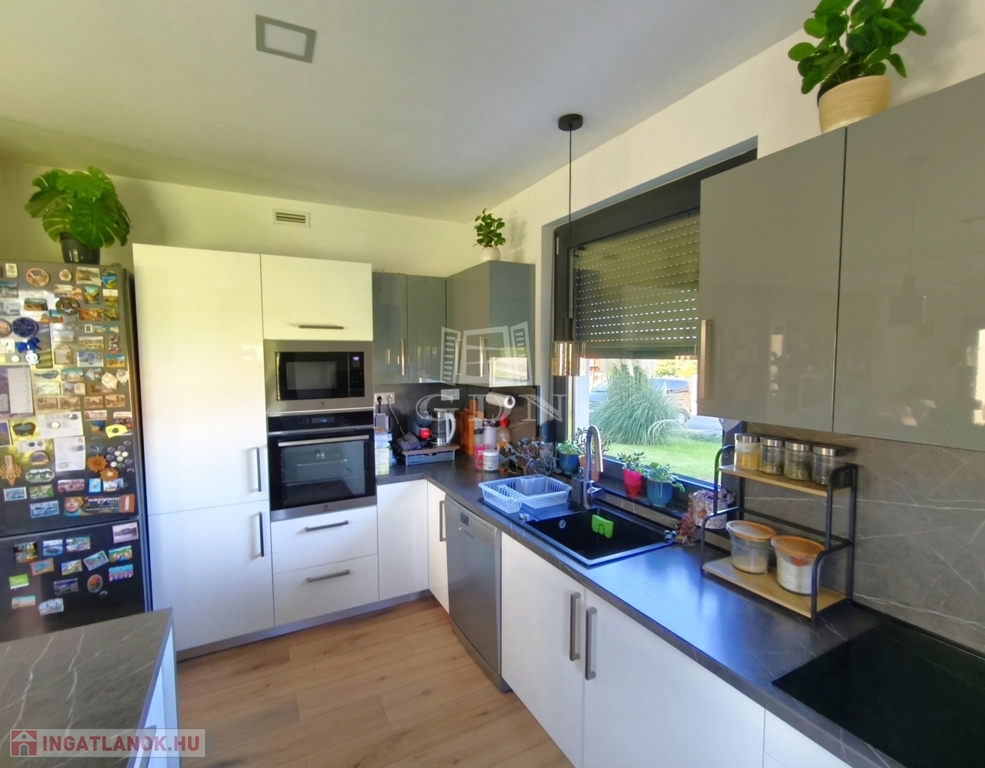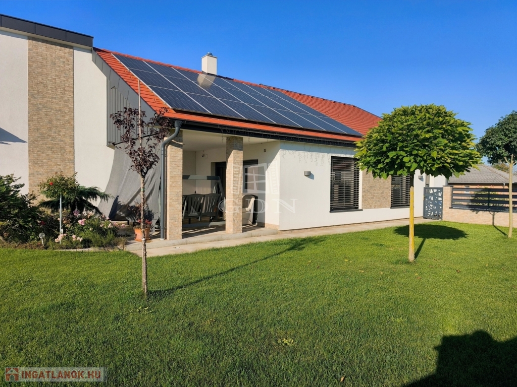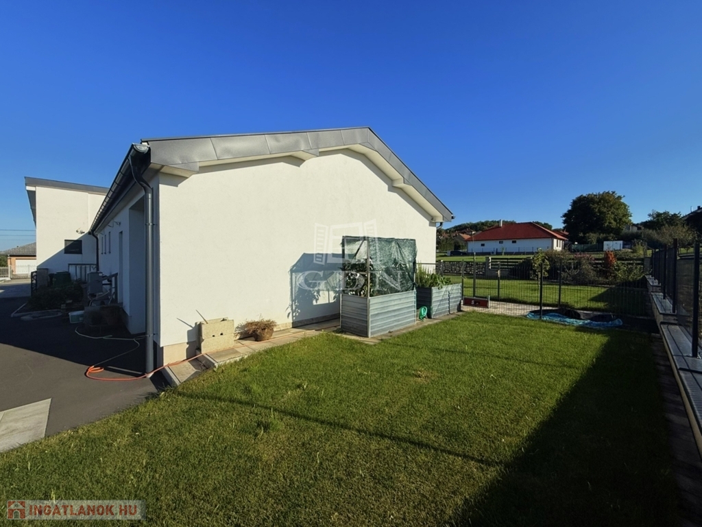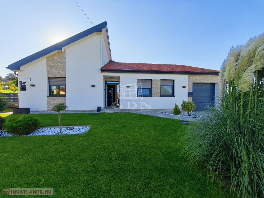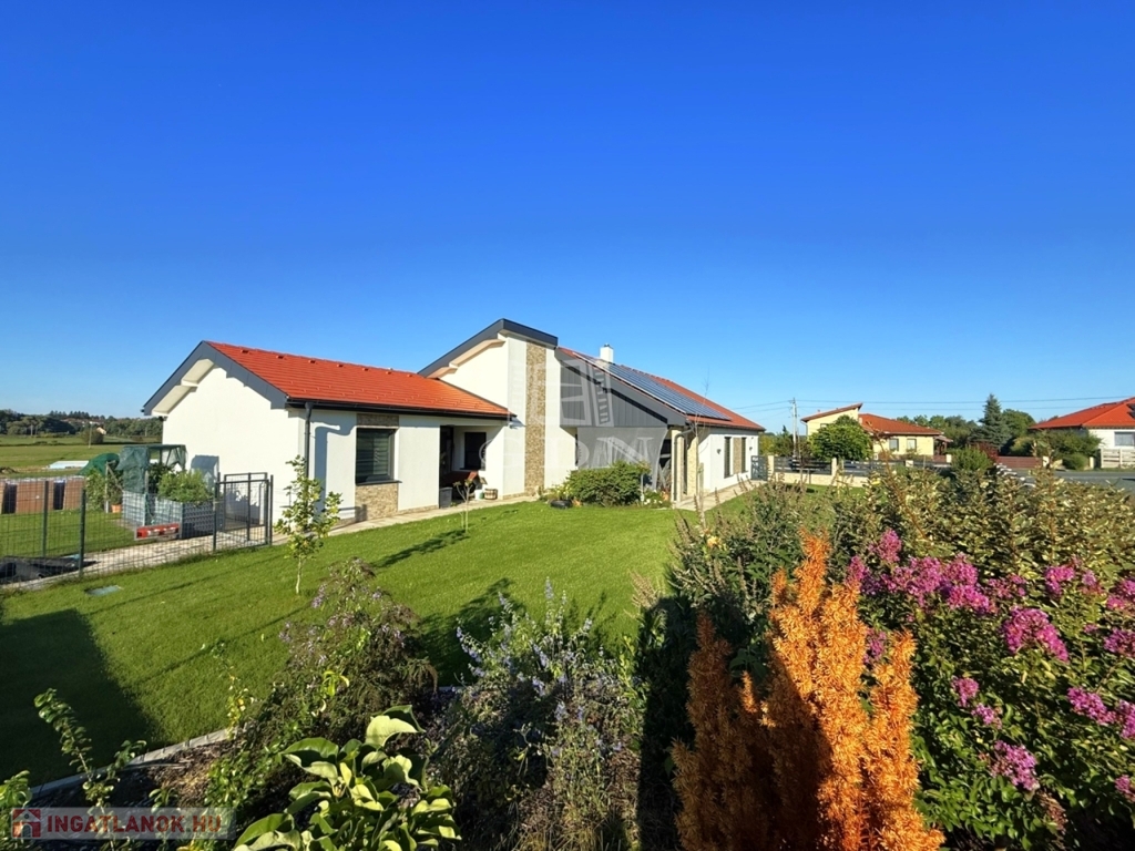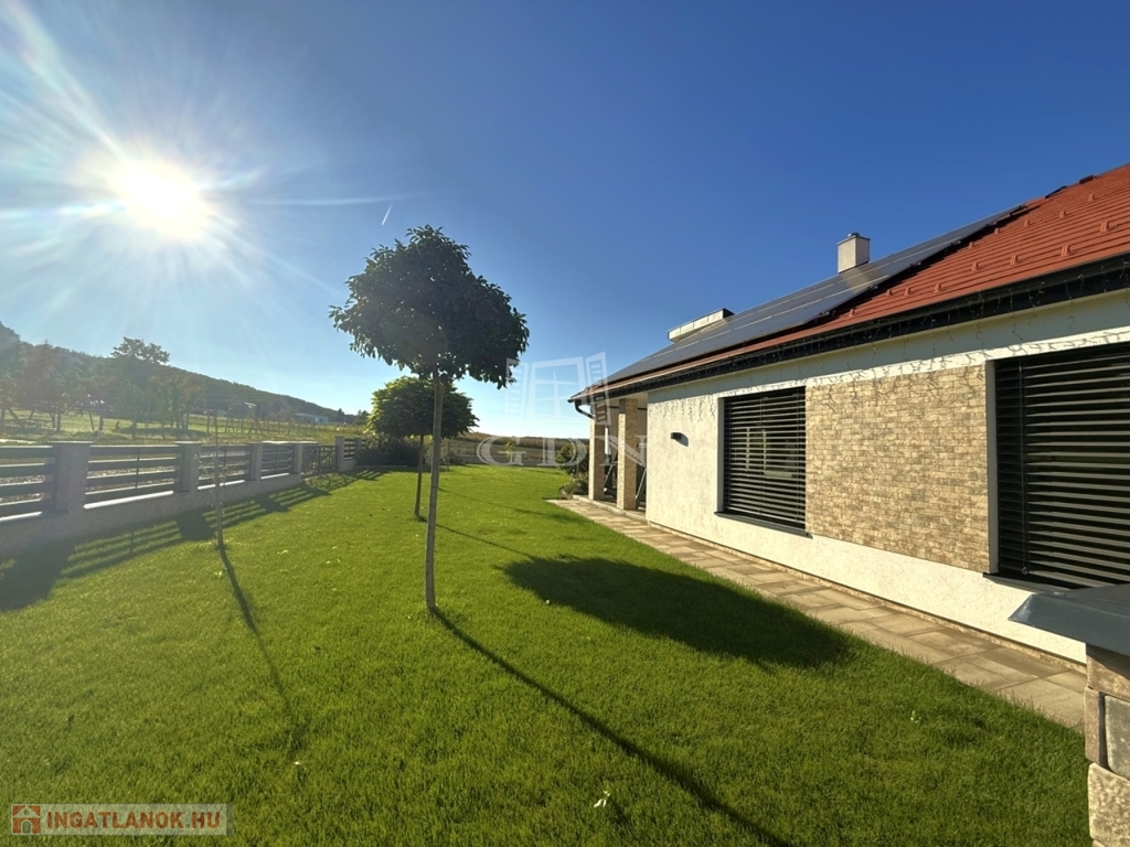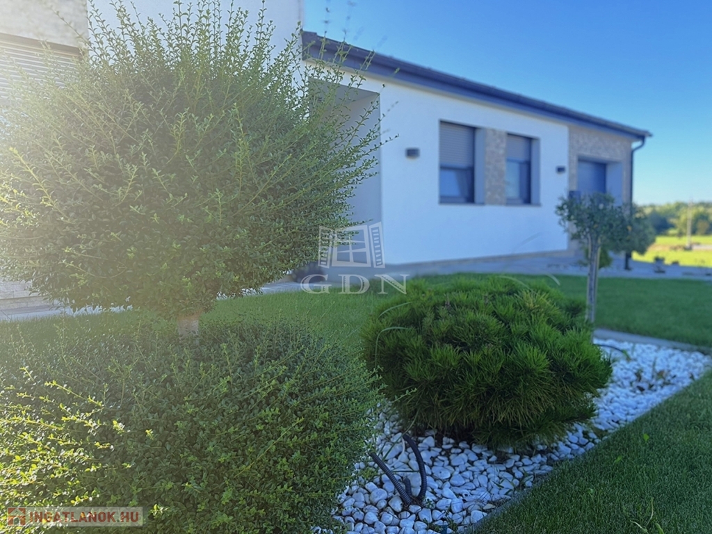 A kert szintén külön figyelmet kapott: fúrt kút, automata öntözőrendszer, robotfűnyíró és gyepszőnyeg biztosítja a rendezett, zöld környezetet.