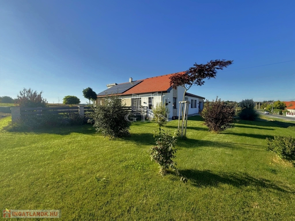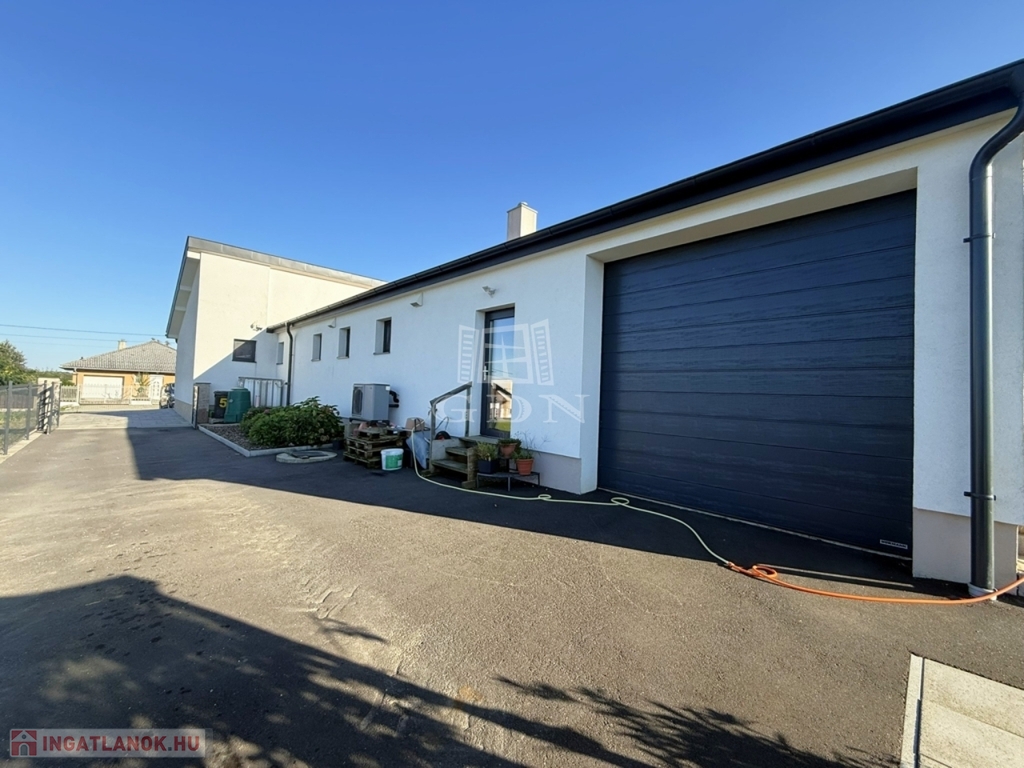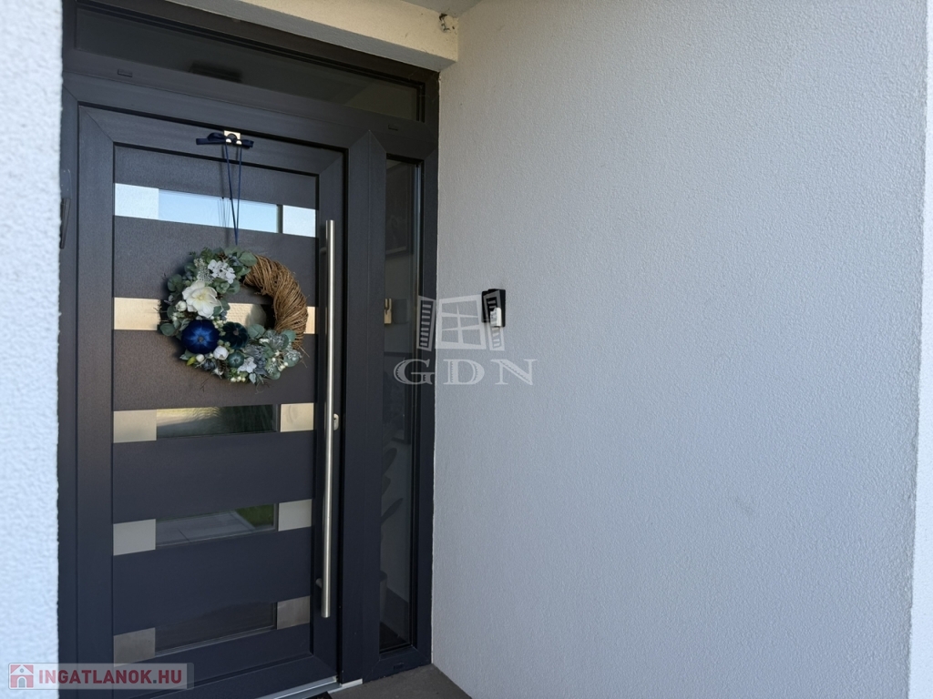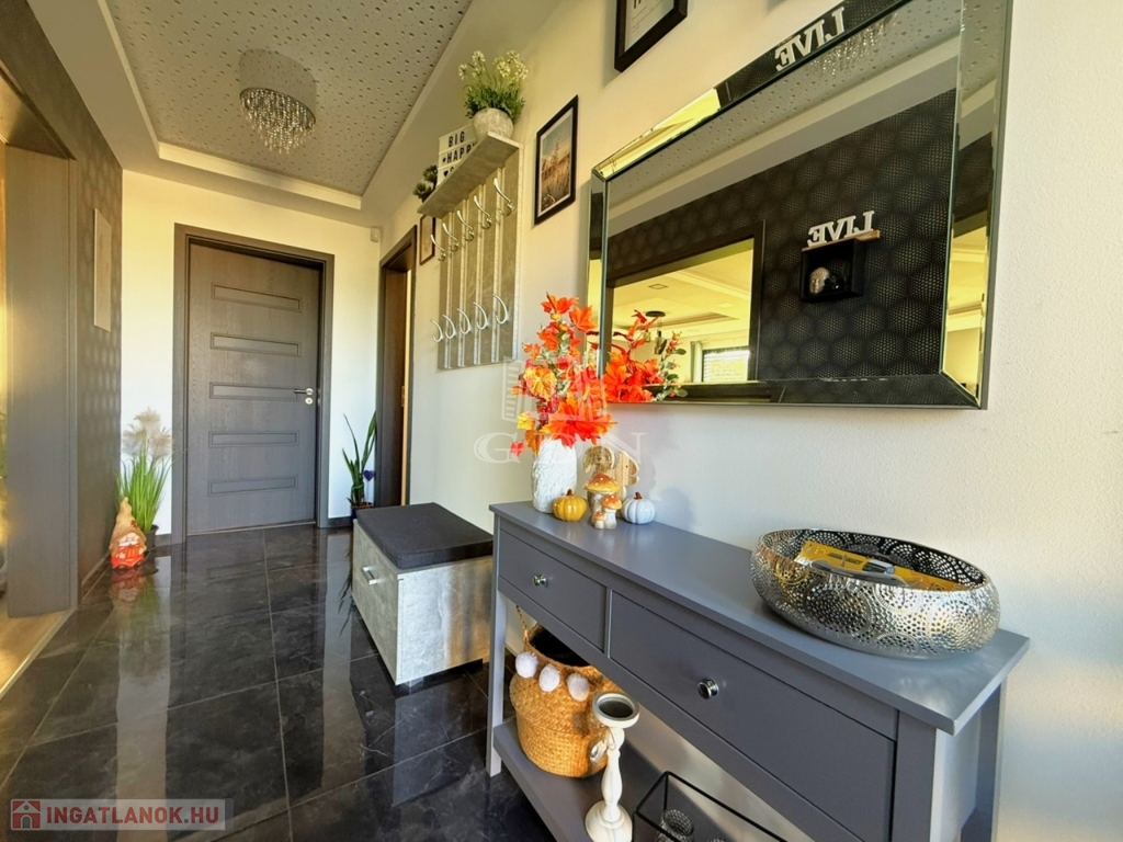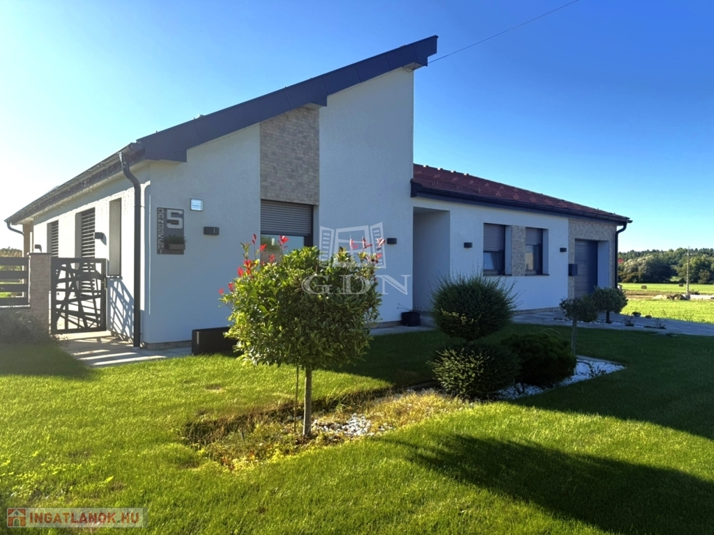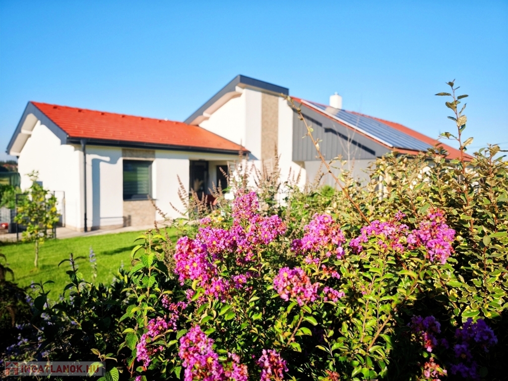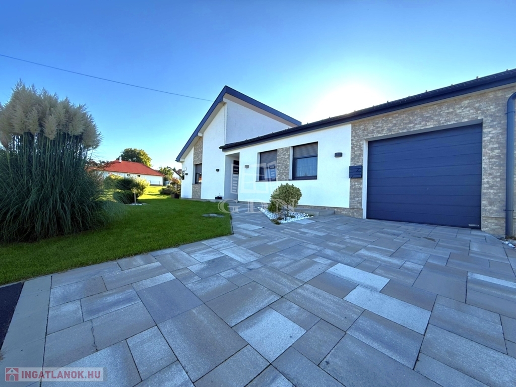A kert szintén külön figyelmet kapott: fúrt kút, automata öntözőrendszer, robotfűnyíró és gyepszőnyeg biztosítja a rendezett, zöld környezetet.