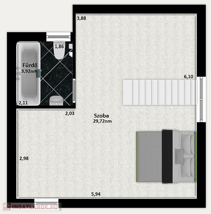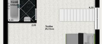A tetőtérben egy szoba és egy fürdőszoba kapott helyet.
