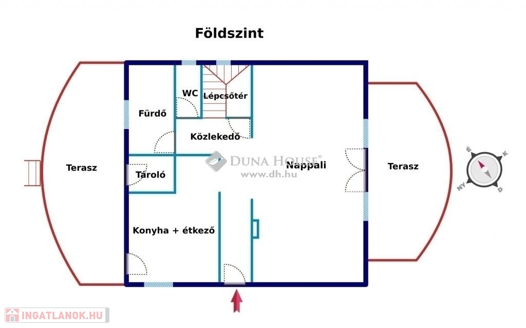 A ház középpontja a rendkívül tágas, 44 nm-es nappali, amihez egy 22 nm-es terasz kapcsolódik. Szintén a földszinten található külön helyiségben a konyha, ami méretének köszönhetően az étkezőt is magában foglalja. Ugyanitt tágas, nagy ablakos fürdőszoba zuhanyfülkével található, a wc külön helyiségben van.