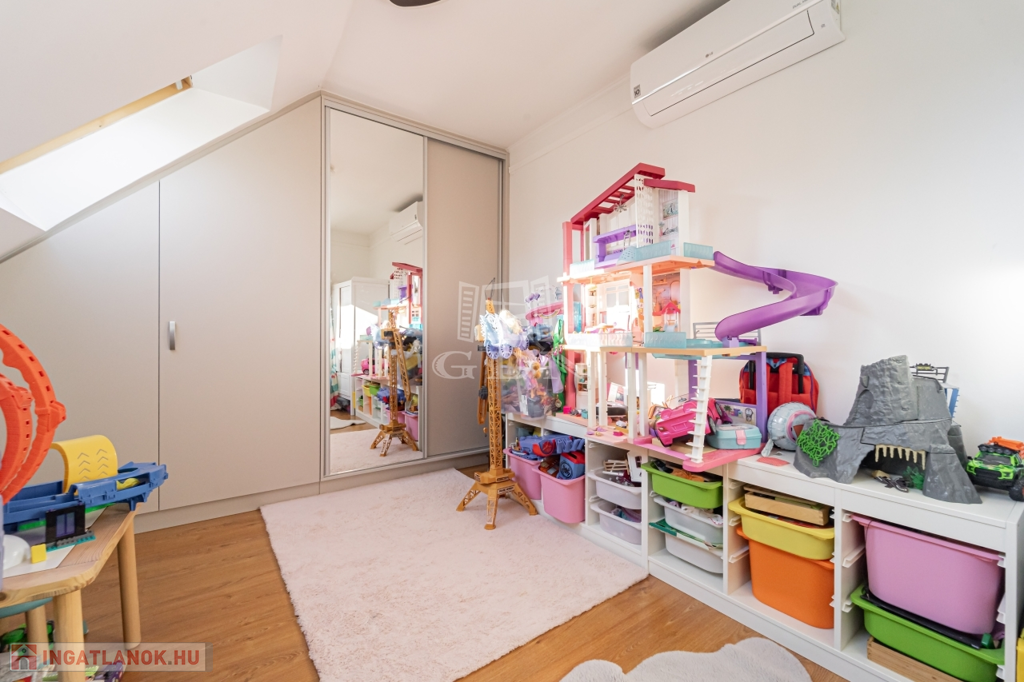 A ház különlegessége a saját wellness szint, ahol egy szauna, jakuzzi és sófallal ellátott pihenőtér is helyet kapott – tökéletes kikapcsolódás az év bármely napján. Emellett összesen 5 szoba és 4 fürdőszoba szolgálja a kényelmet, köztük egy teljes szülői lakrész panorámás terasszal.