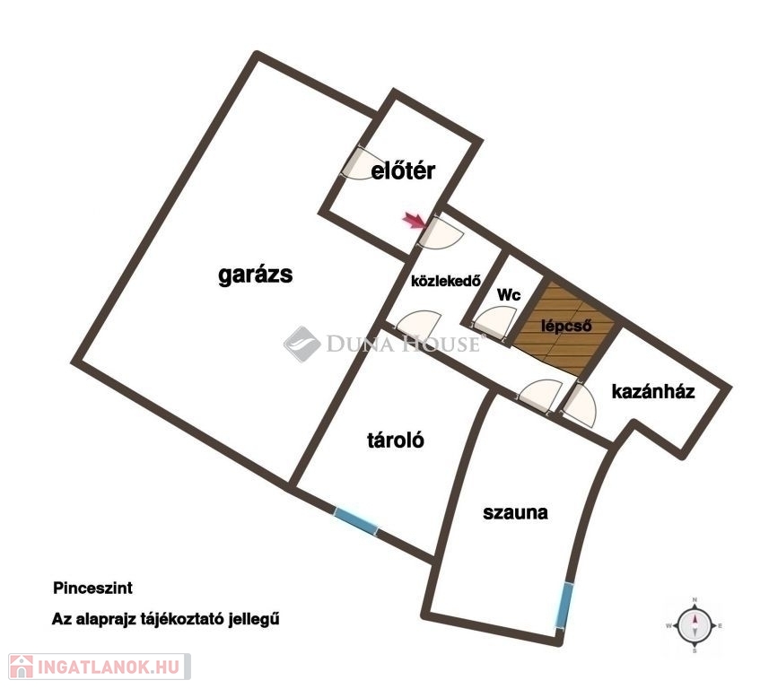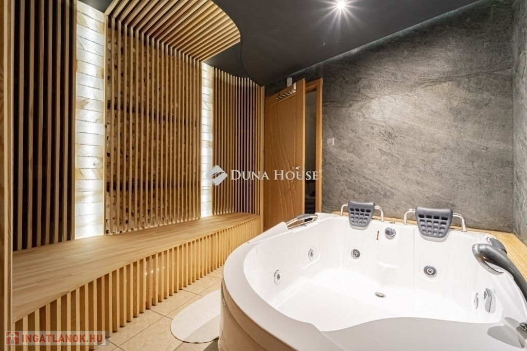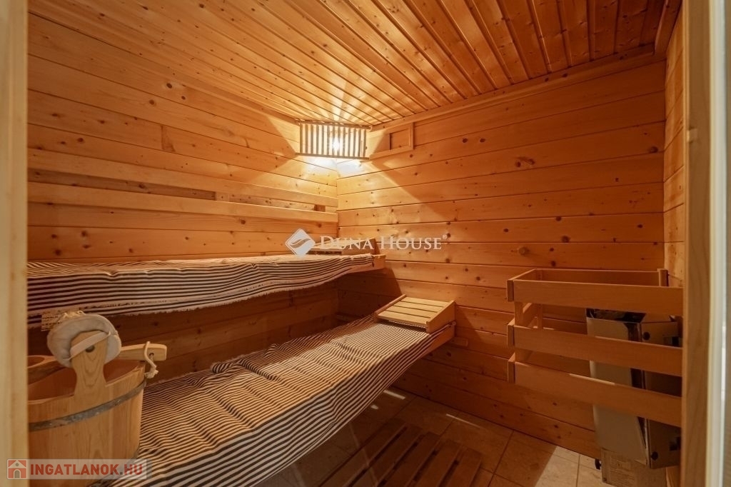 Alagsor: gépészet, háztartási helyiség, vendégszoba, valamint egy külön kialakított relaxációs tér szaunával, jakuzzival, sófallal.