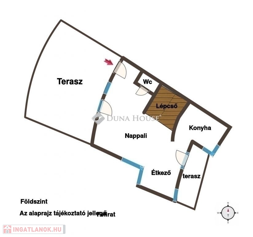 Földszint: modern, gépesített konyha; világos nappali-étkező közvetlen teraszkapcsolattal; vízteres kandalló; külön mellékhelyiség.